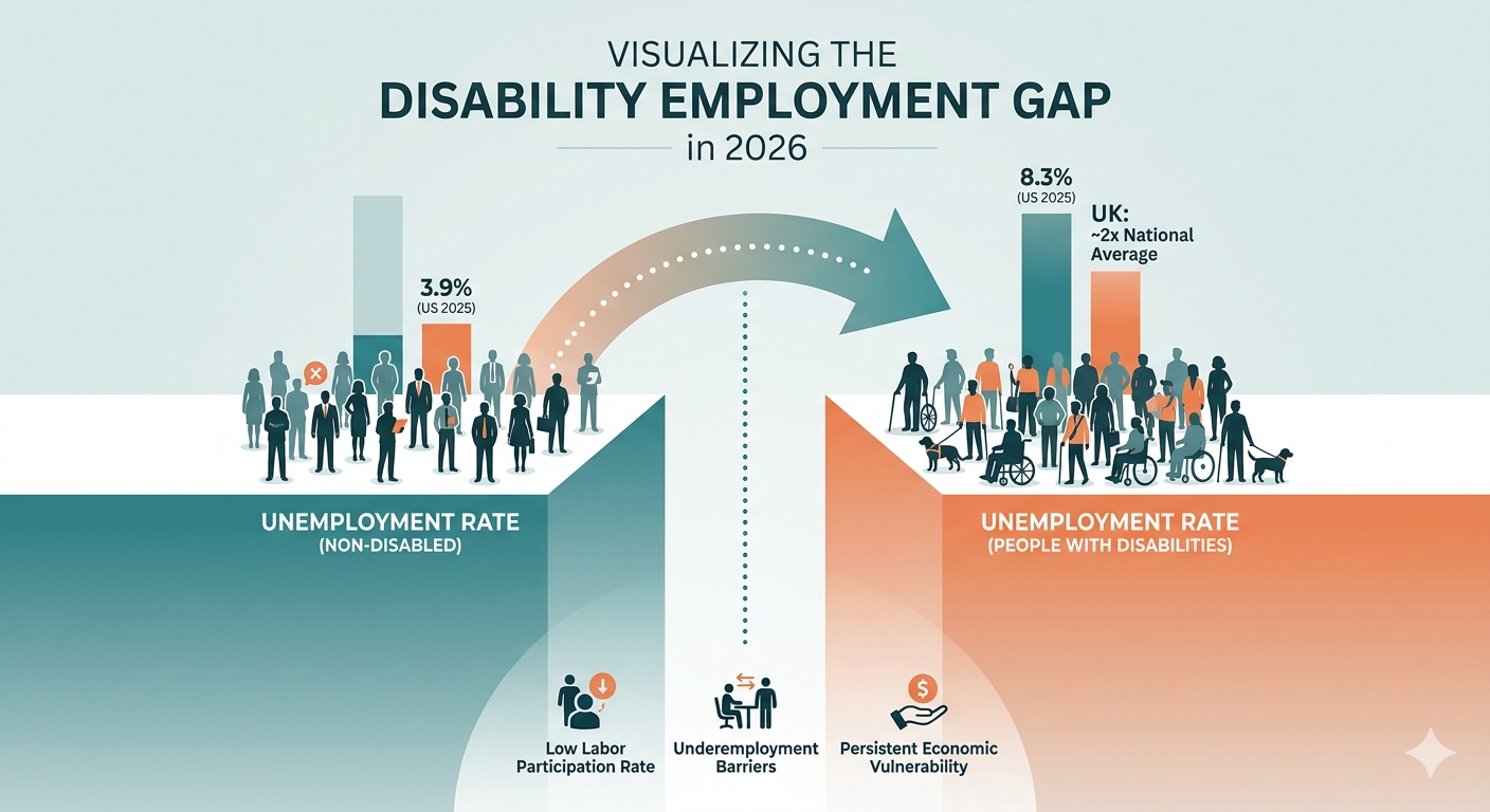 In 2026, people with disabilities are still about twice as likely to be unemployed. Explore the numbers, barriers, and the rise of inclusive hiring and remote work.